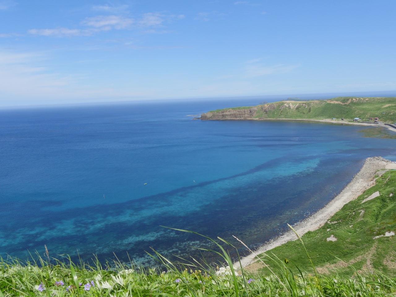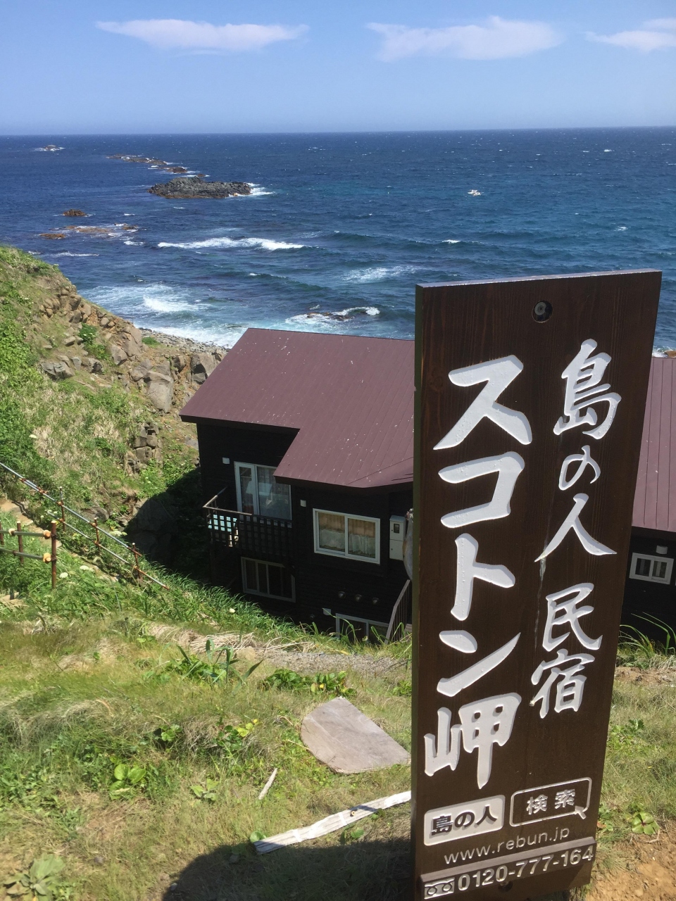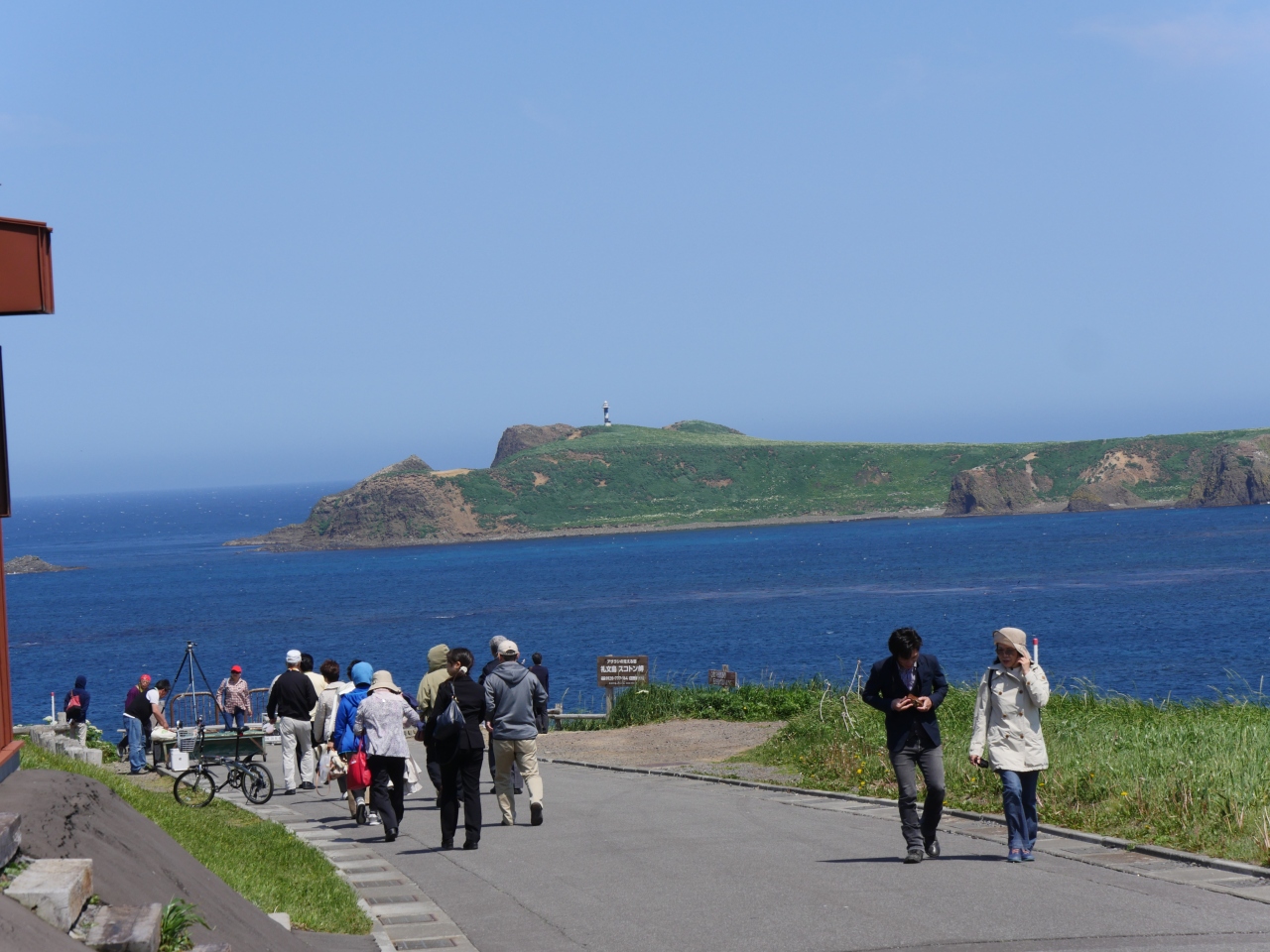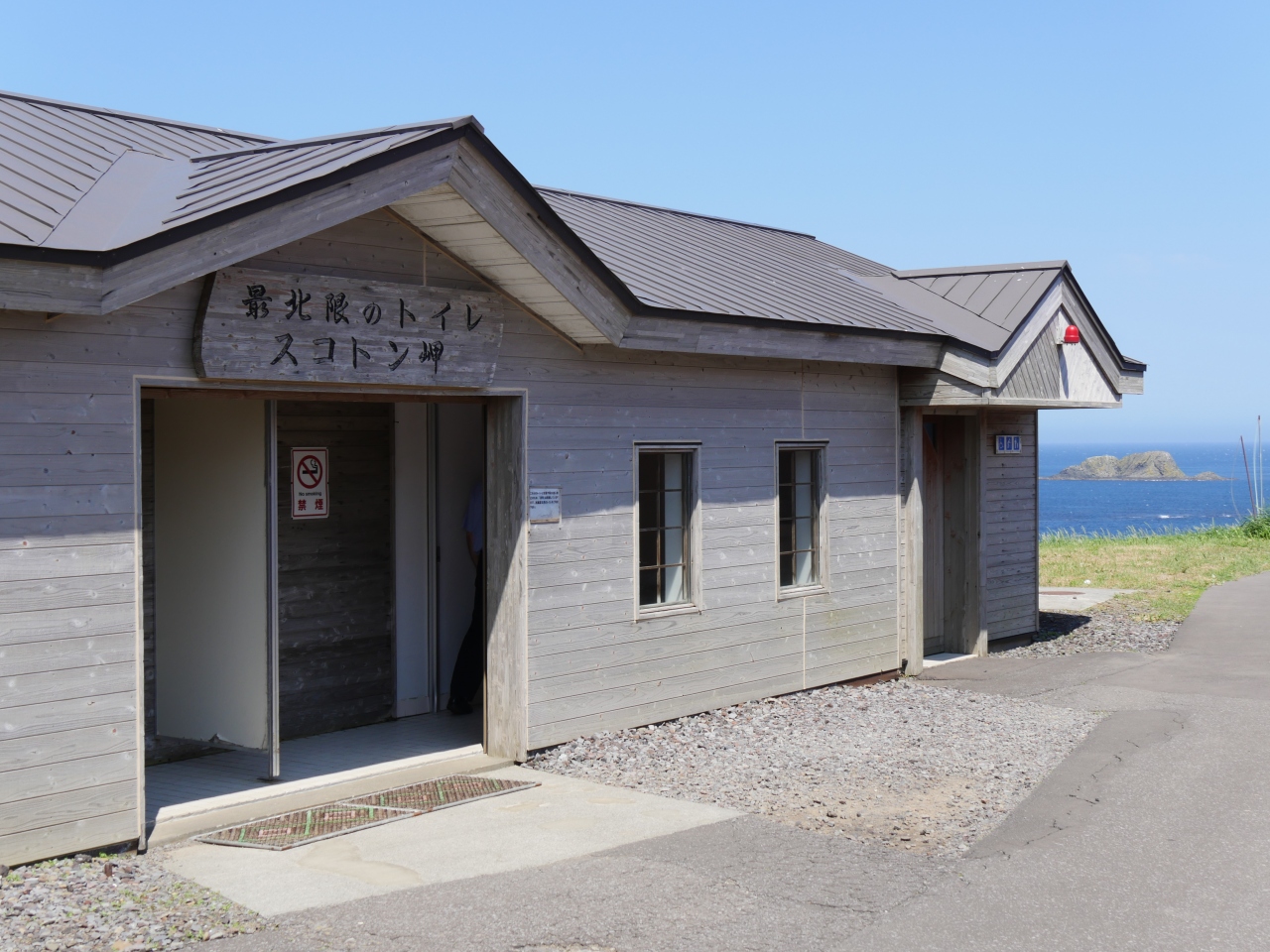 定期観光バスで訪れ、レンタカーでも行きました。礼文島は狭いので最北限といってもフェリーターミナルから40分もかかりません。トド島を望む風光明媚な場所です。礼文観光の目玉スポットです。観光バスが次々着いていましたが、去った後は静かです。土産店とトイレがあります。最北のトイレを写真に撮りました。
