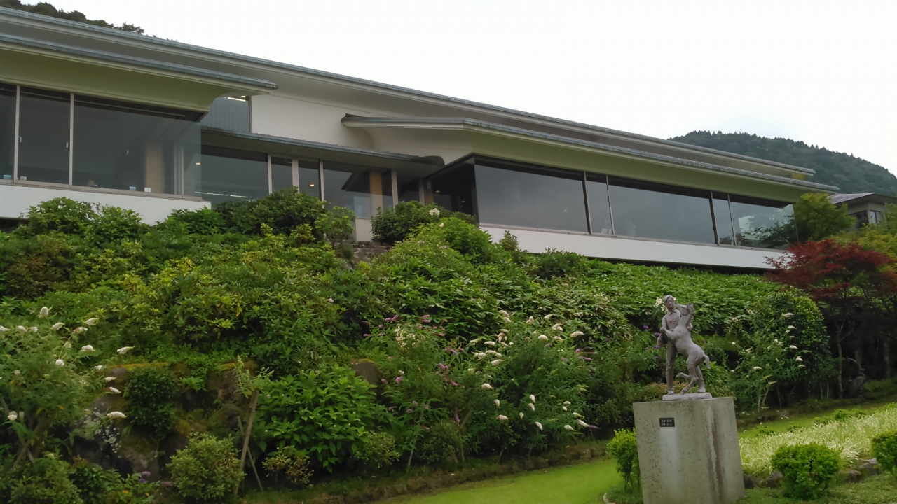海賊船を元箱根で降りて、ちょっと上を見上げると、すぐわかりました。下からはエスカレーターがあり、入口まで楽です。帰りは坂道を下って徒歩4分。どのガイドブックを見ても「景色が素晴らしい」と書いてありますがその通り。晴れると芦ノ湖と富士山がはっきり見えるようです。残念ながら曇っていました・・・日本画が展示されています。