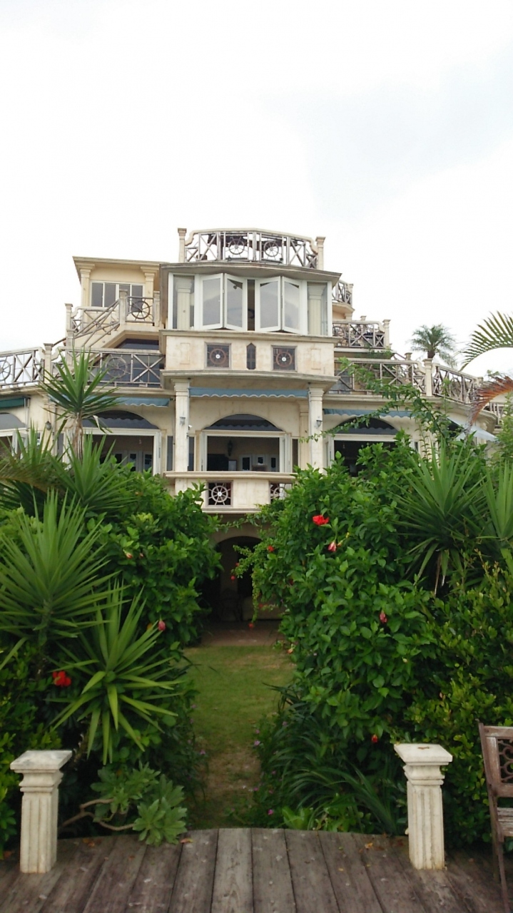 海だけでなく、素敵な広いお庭を眺められる大きな窓がいくつも並ぶ店内には、ヨーロッパ調の家具に、グランドピアノまでおかれています。ここは元々何だったんだろう?カフェとして使われてるのは二階だけで、三階も屋上も。ここからの景色も素敵です。