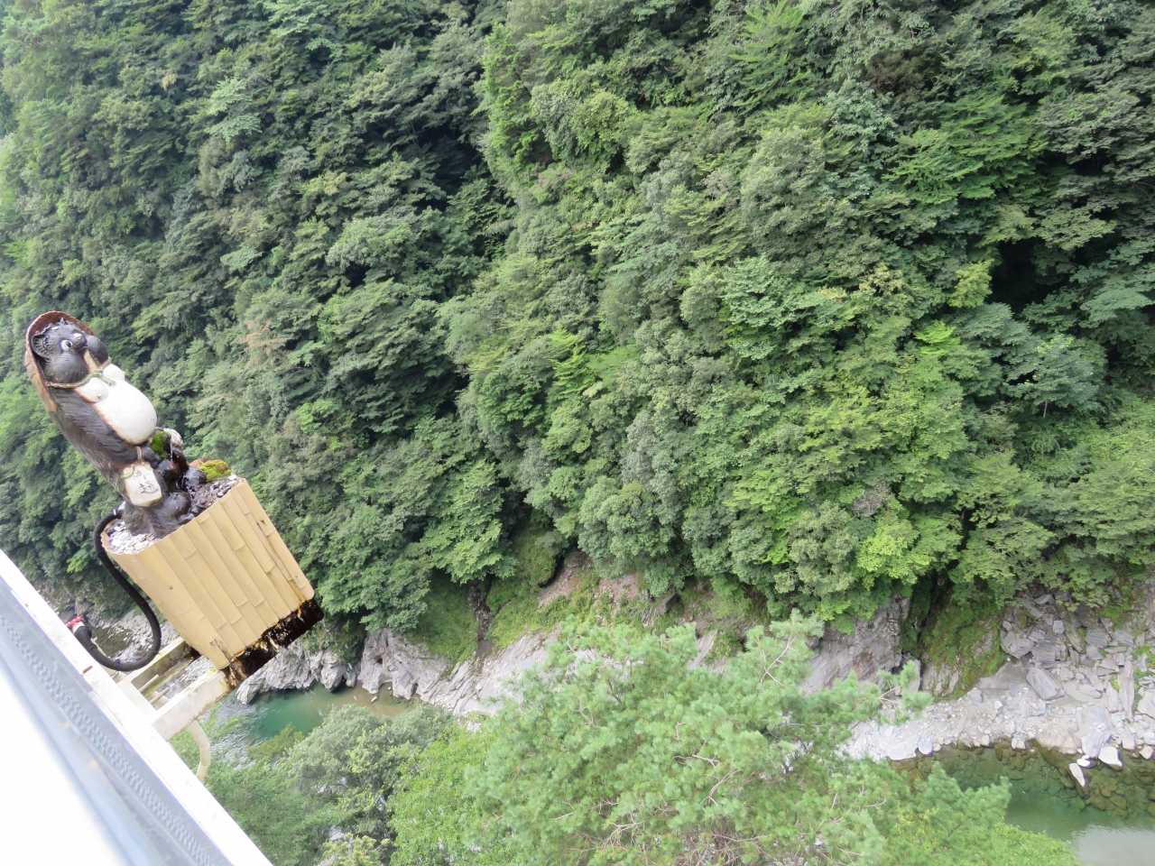 お会計を済ませテラスに出てみると、信楽焼きのたぬきが外に突き出すようにして渓谷を眺めていました(笑)