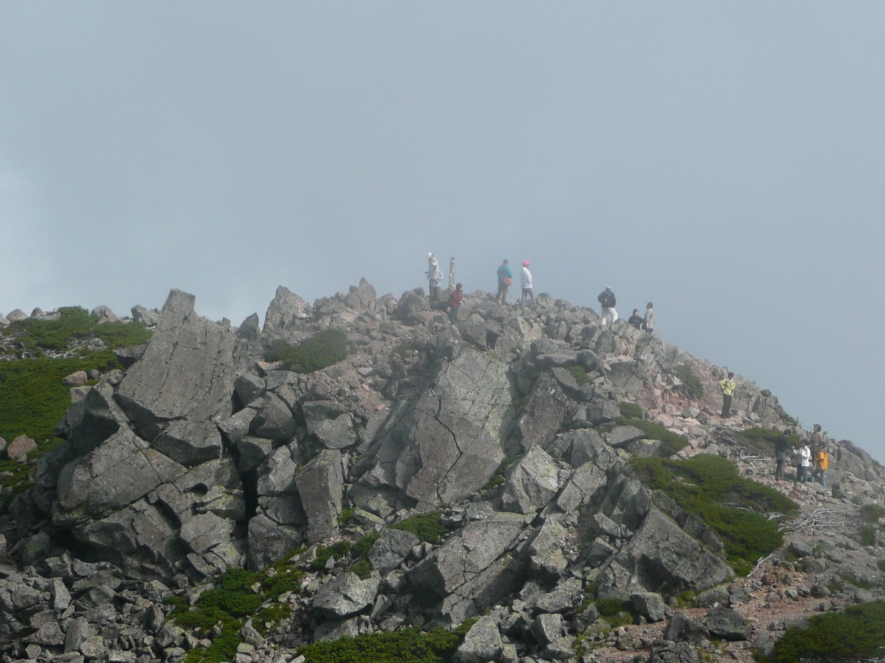 畳平に到着したら、添乗員の案内で、近くにある魔王岳(2,764m)いう名の丘に登りました。標高が高いので、高山病予防のため、ゆっくりと歩行するようにと、注意を受けました。丘の上は、パノラマ・ビューが広がる展望台で、乗鞍岳の山頂もまじかに展望できました。