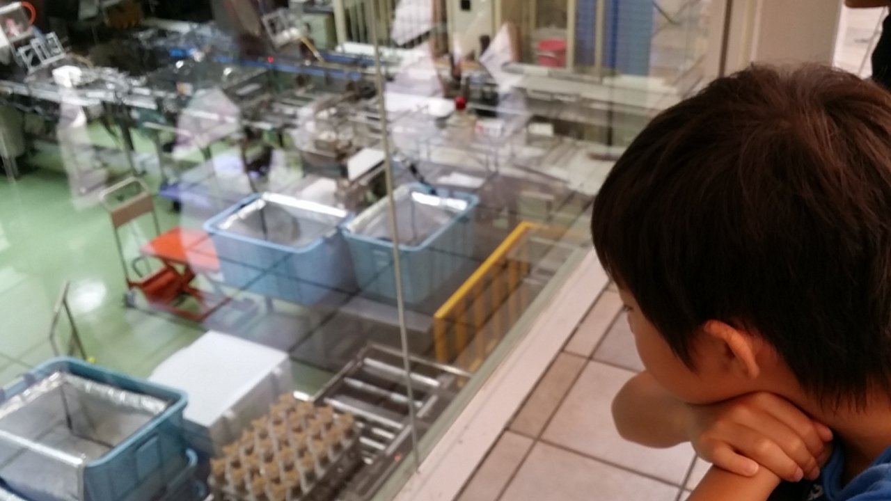 無料試食コーナーがあります。窓越しにアイスの包装レーンなどを