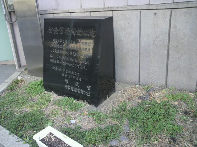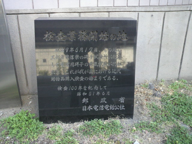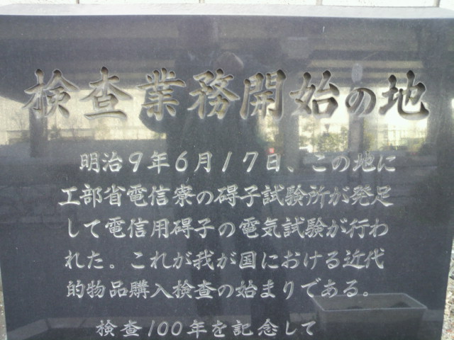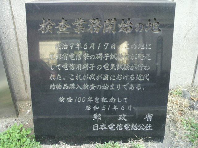 検査業務開始の地の碑が、銀座8丁目の南側、汐留駅の東側にあります。