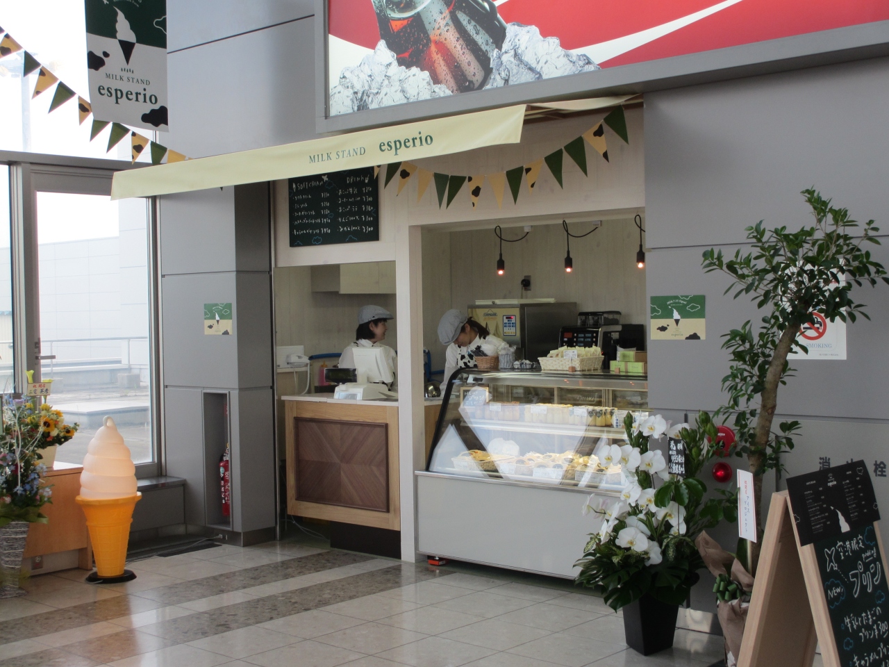 地産食材を使ったレストランです。2016年7月に旭川空港2階出発ロビーにミルクスタンドを開店しました。ソフトクリームやドリンク、土産物として機内持ち込みができる瓶詰めのプリンを販売しています。コクのあるプリンと底のカラメルソースをかき回しながら食べました。出発便を待つ間、ソフトクリームを食べたり、コーヒーを飲んだり利用する人が多かったです。