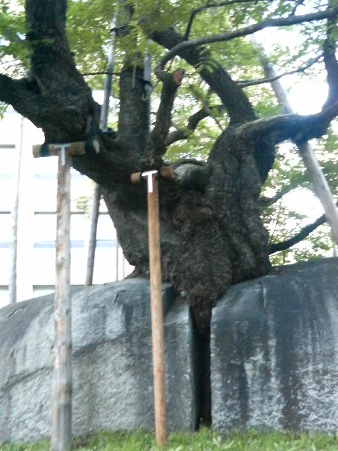 岩の間に根と幹をのばした立派な桜の木で、夏は緑に包まれた姿を拝むことができます。