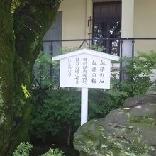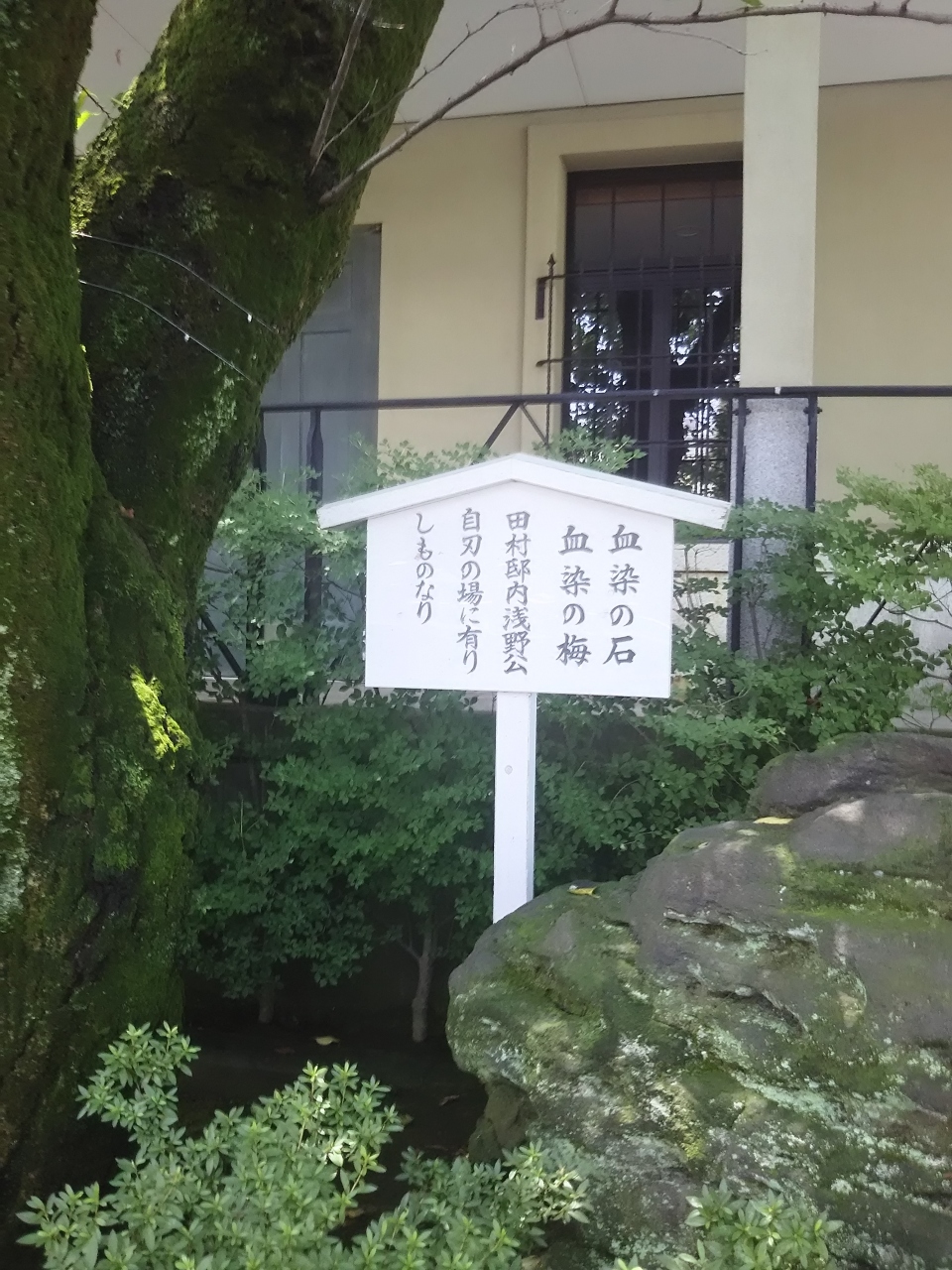 泉岳寺の中央にあります。映画や小説などでよく描写れてる浅野内匠頭が田村邸の庭先で切腹した際に、その血がかかったと伝承されている梅木と石です。すこし怖い感じもします。最寄り駅は、都営地下鉄泉岳寺徒歩3分で便利なところにあります。
