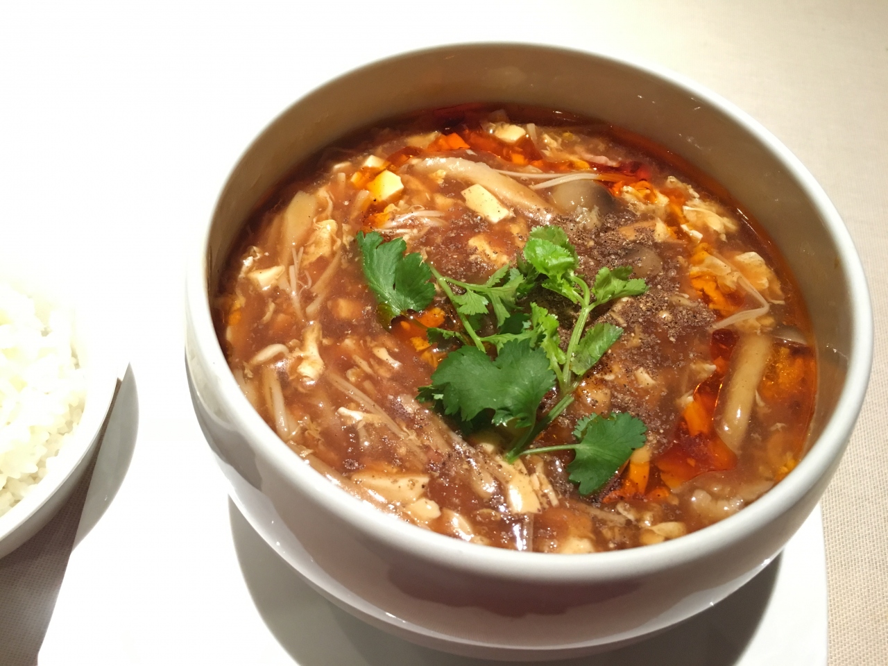 ランチで利用しました。ランチセット(リーズナブルな方)は4種類。スーラータン麺を注文しました。見た目は小ぶりの丼ですが具がたくさん入っていて食べ応えがありました。酸っぱすぎず、辛すぎず食べやすかったです。プラスでご飯を注文しましたが、ザーサイなり小鉢があれば尚良かったです。麺だけではちょっとさびしいかも。