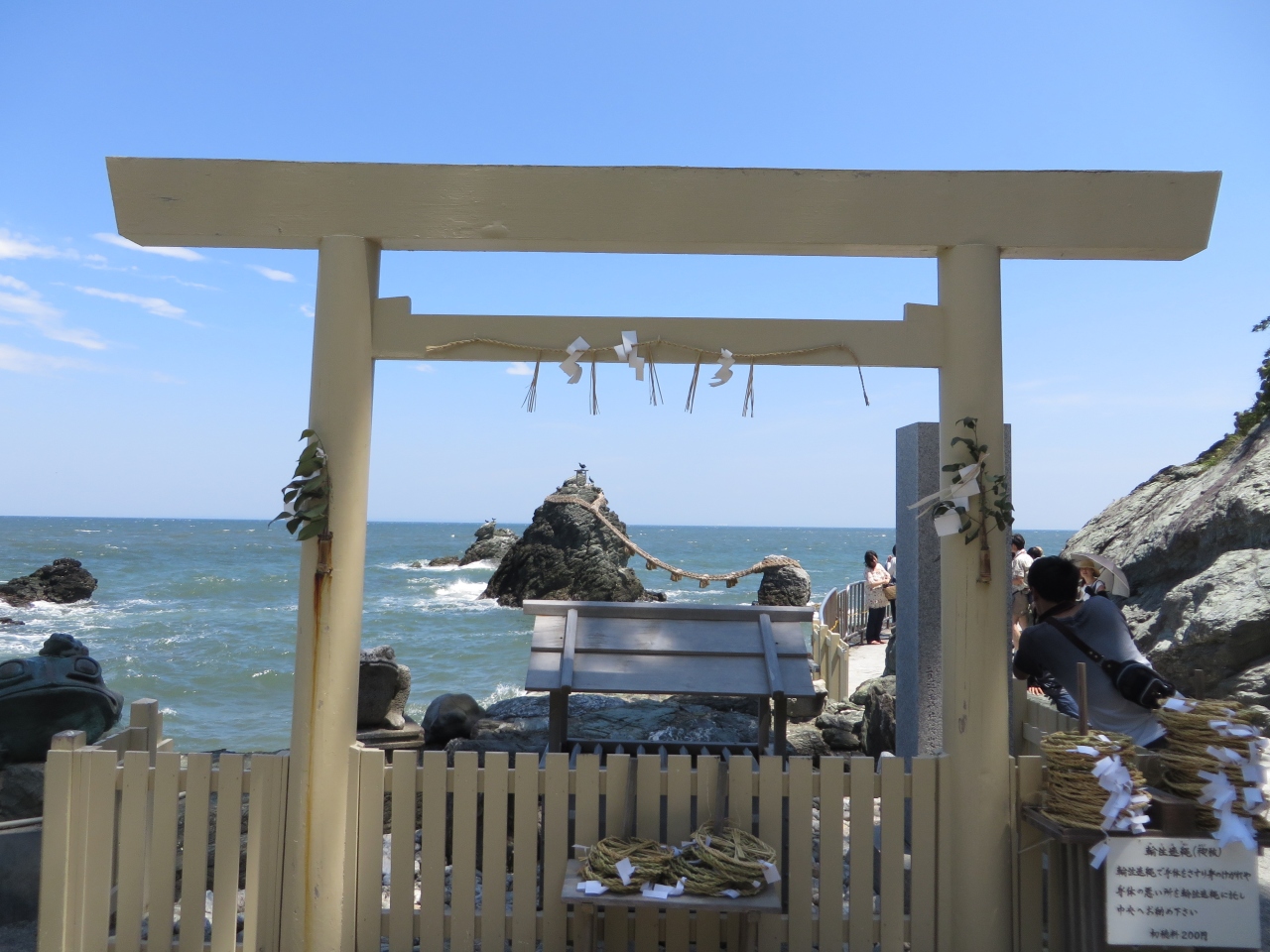 二見浦の海岸線に沿って、遊歩道のように神社の参道が整備されていて、絶好の景観ポイントになっています。社殿の更に奥に遊歩道が延びており、夫婦岩を間近に見られるようになっていました。神社の中のいたるところにカエルが祀られていました。