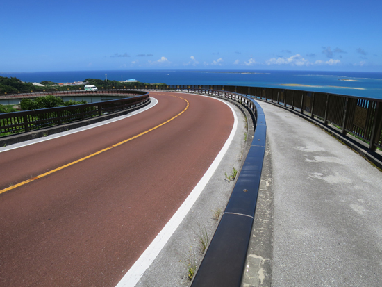 佐敷方面から橋を下るように走っていくのがおすすめです。あまりの絶景に私たちは橋を下りきった所でUターンして、もう一度、眺めを楽しんでしまいました。橋の手前で路駐して歩いていくと、海と橋を眺められる展望台のような場所もありました。