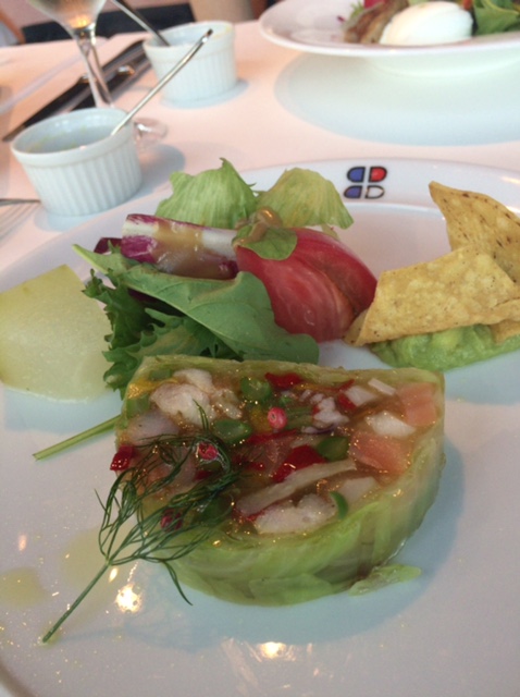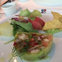 前菜は色とりどりの魚介と野菜のジュレ サフラン風 アボガドのディップ