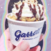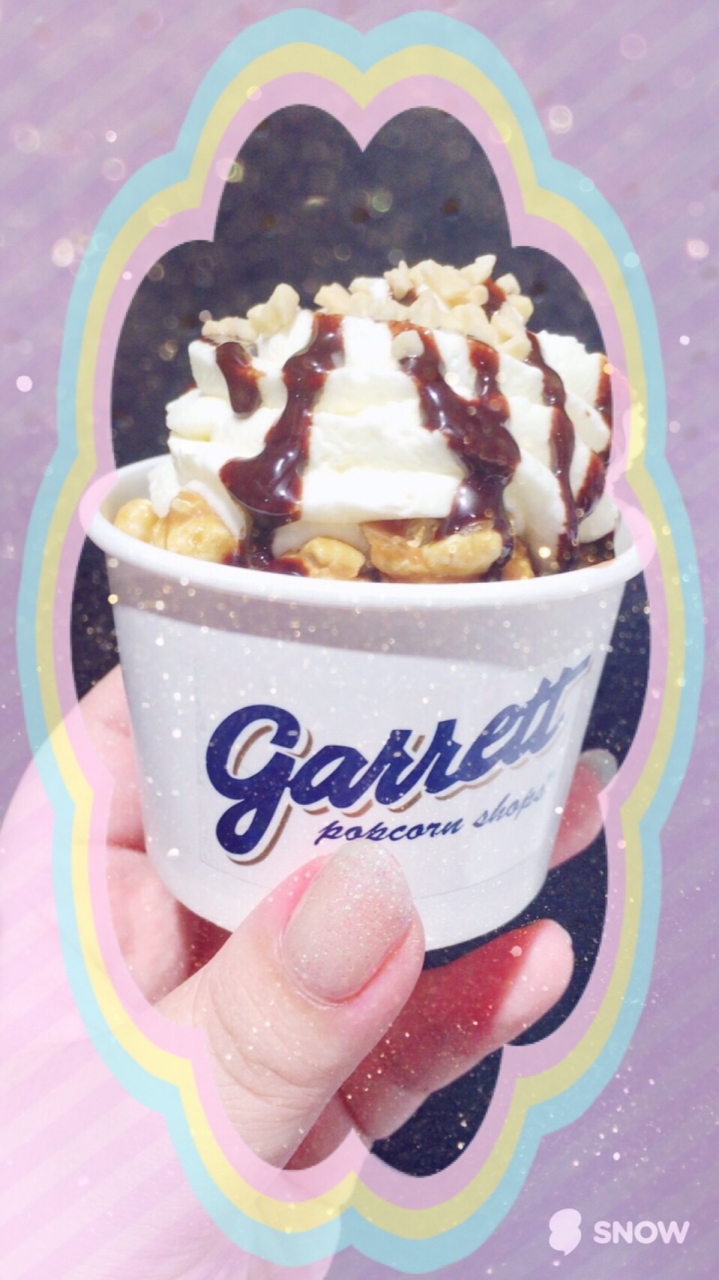 いつ行っても並んでいます 開店してもう2年以上は立ちますが本当に人気のショップです いつもはポップコーンだけですが 今回は8月限定フィラデルフィア、キリのチーズをポップコーンの上にのせて・・チョコソースをかけてあるものを注文しました