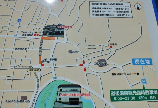 道後周辺観光のための無料駐車場が温泉南東にありますが、今まで二回ほど行った際(いずれも休日)、駐車場はガラガラでした。最初、あまりにも駐車している車が少ないため、場所を間違ったのではないかと思ったほど。