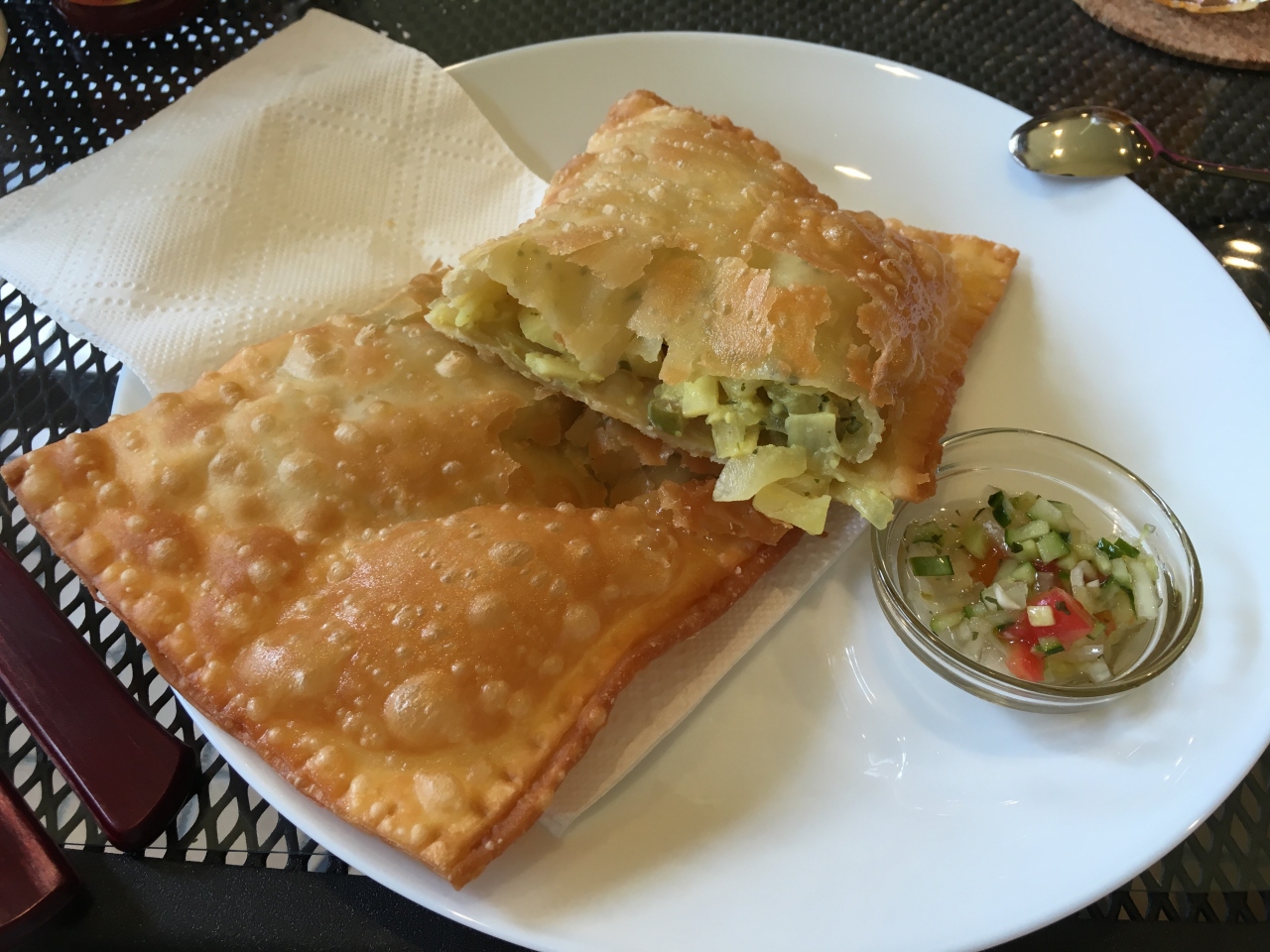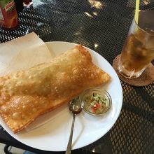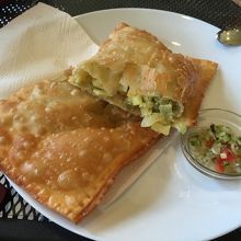 塩気のある大き目の餃子の皮(?)の中に、香草とターメリック(?)風味のヤシの新芽、オリーヴが入っていまして、カラリと揚げてありました。特に可もなく不可もなく...な、お味でした。