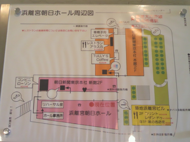 浜離宮朝日ホールのある区域は、3つの大きな建物から構成されているため、入り組んでいますが案内図に基づき、移動ができます。