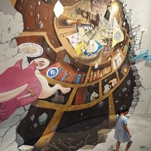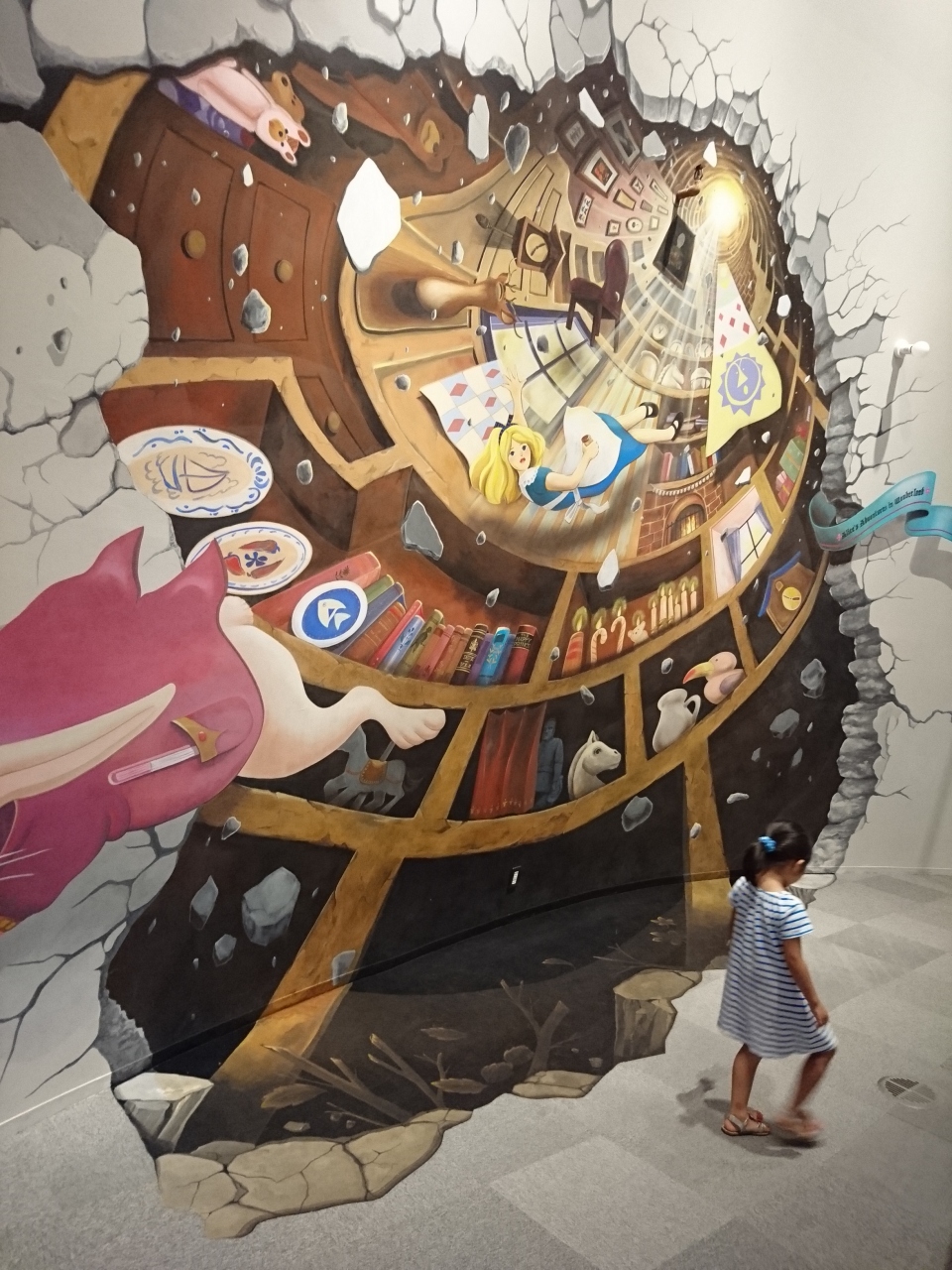 スロープを下りながら、不思議の国のアリスの展示を楽しめ、