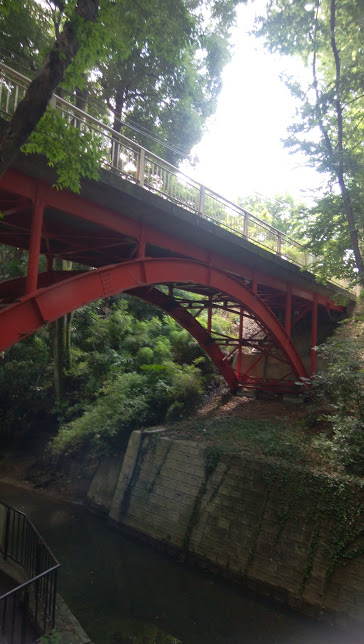 等々力渓谷に架かる赤い色の鉄骨の橋