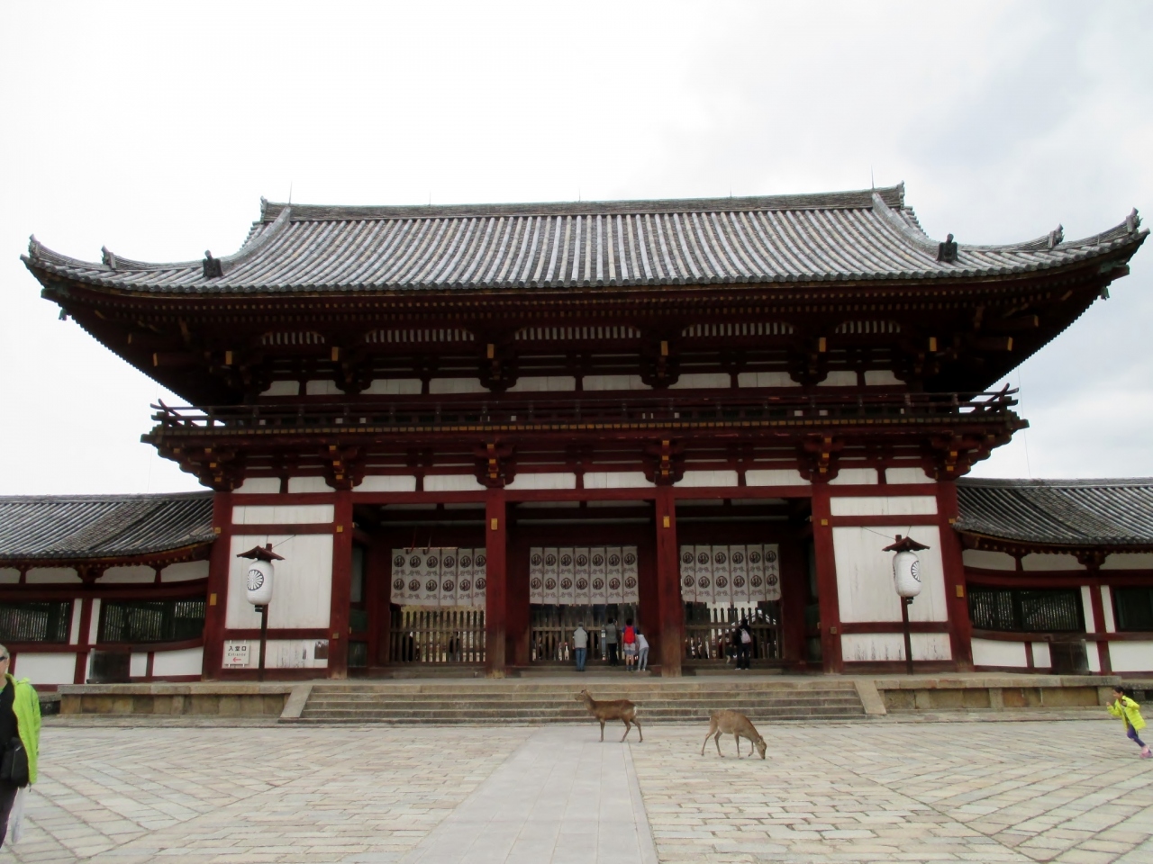 南大門からまっすぐ進み、大仏殿の手前にある楼門です。重要文化財に指定されています。左右に回廊が伸びていて、白と朱の美しい色合いが印象的でした。中門からまっすぐ向こうは大仏殿ですが、中門をくぐることは出来ません。