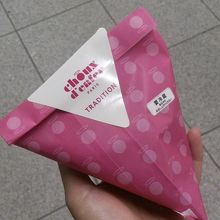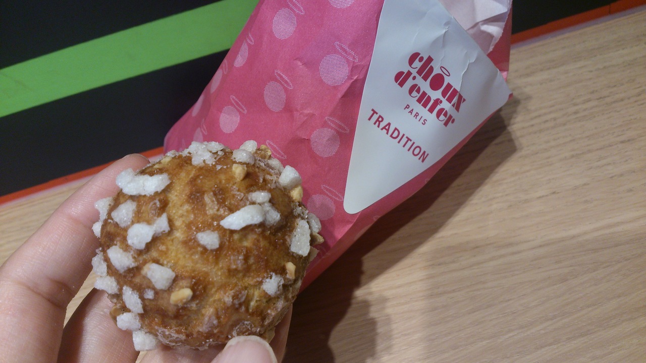 とりあえず三種類入っているセットにしました。中身はその場で入れてくれるし、外はカリカリの生地でナッツがちりばめられています。ショコラ、キュラメル、アグリュムの三種類でアグリュムはカスタードみたいでした。三個で290円です。朝9時くらいだったので並ばないて買えました。