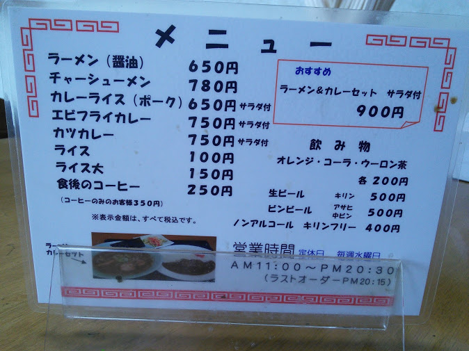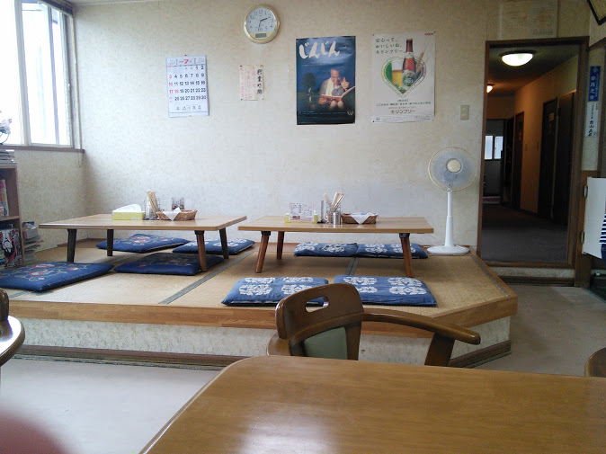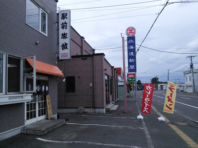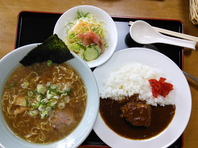 宗谷本線剣淵駅の駅前にある旅館だが、旅館だけでも儲からないので食堂を始めたとのこと。名物は何と言ってもカレーライスとラーメンのセット900円だ。900円と言うとラーメンと半ライスのセットが多いが、ここのセットは驚くなかれ、どちらもたっぷり一人前の大きさがある。加えてサラダもセットになっている。噂には聞いていたが、フルサイズのカレーライスと、フルサイズのラーメンとサラダが出てきたときには思わず笑ってしまう。しかもカレーライスの皿の真ん中には赤ちゃんのこぶし大の牛肉が鎮座ましている。トロトロに煮込んだビーフシチューと呼んでもよい代物だ。味も合格レベルでコスパ抜群なので、昼飯時はこの片田舎で混雑するらしい。食堂には4人掛けテーブル2と4人掛け座卓2の16人分の席があるが、混雑するときは旅館の客室も利用するらしい。我々が行ったのは土曜日の午後2時半頃だったので、他の客は皆無だった。