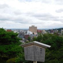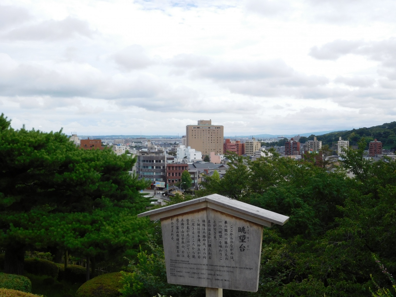 兼六園の桂坂入口から入って、霞ヶ池の辺りまで来ると、ぱっと視界の開けた眺望台がありました。周囲にはベンチもあり、小休憩する事も出来ます。結構、高い場所まで登って来たんだなぁ、と実感が出来ましたが、趣のある日本庭園から眺めると、ごくありふれた住宅街の景色が広がっているなぁ、という感じでした。