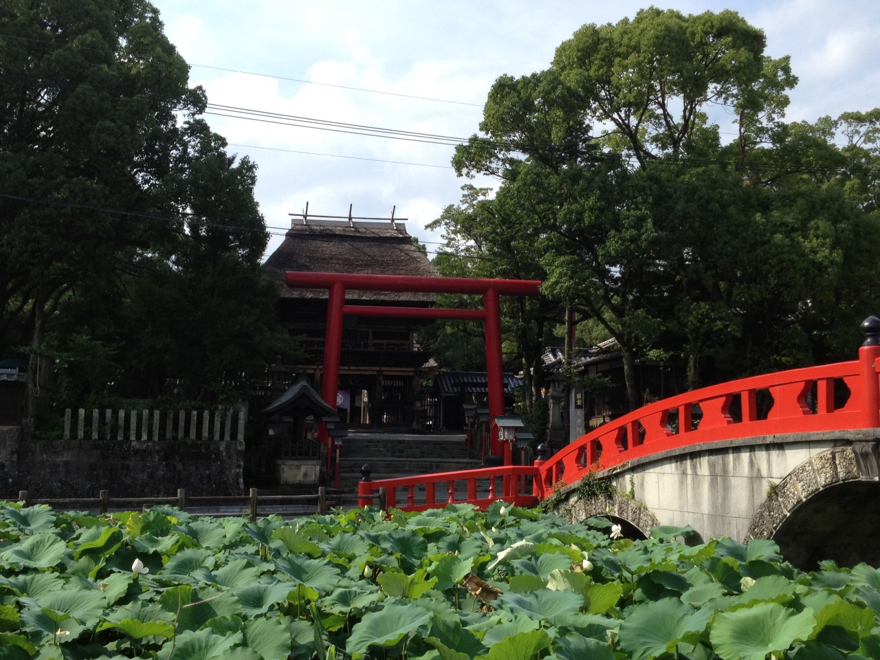 西暦806年(大同元年)壮健の神社で、現在の熊本県の阿蘇神社からの分霊を祀ったのがはじまりといわれており、戦国時代より近代に至るまで統治を治めていた相良氏の庇護があり、本殿などが国宝に指定されています。神社の正門の前には池があり、蓮が生い茂っていました。堀に架かる橋や正門の鳥居は紅く、敷地内は大きな樹木が茂り、古さを感じさせました。