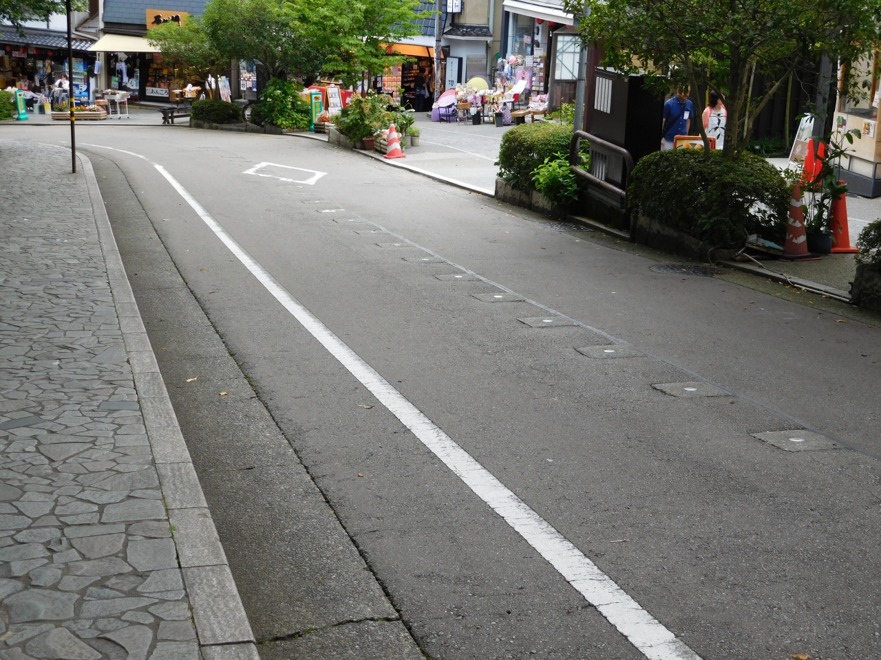 兼六駐車場から、兼六園(桂坂入口)や金沢城公園に向かう際は、この「紺屋坂」を上って行く必要があります。車道の両側には石畳の歩道があり、兼六園側の歩道には、お土産屋さんが沢山並んでいました。ちょっと急な坂道ですが、のんびり歩いて行けば問題無いです。