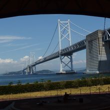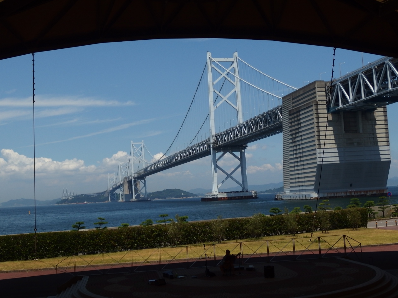 本州・四国間の島々を繋いで架けてあり、全体を眺めた際の微妙なカーブがとてもきれいです。まあよく作ったもんだと感心しました。たまに道路部分の下をとおる電車との対比からもその雄大さを感じられます。 また、海の青と橋の白のコントラストもイイですね。