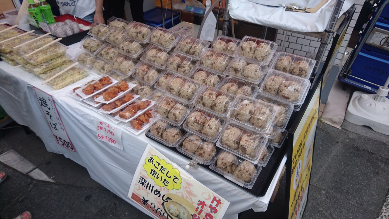 深川八幡祭りの時に、店頭で深川めしのおにぎりや、やきそば、ソフトクリーム等を販売していました。