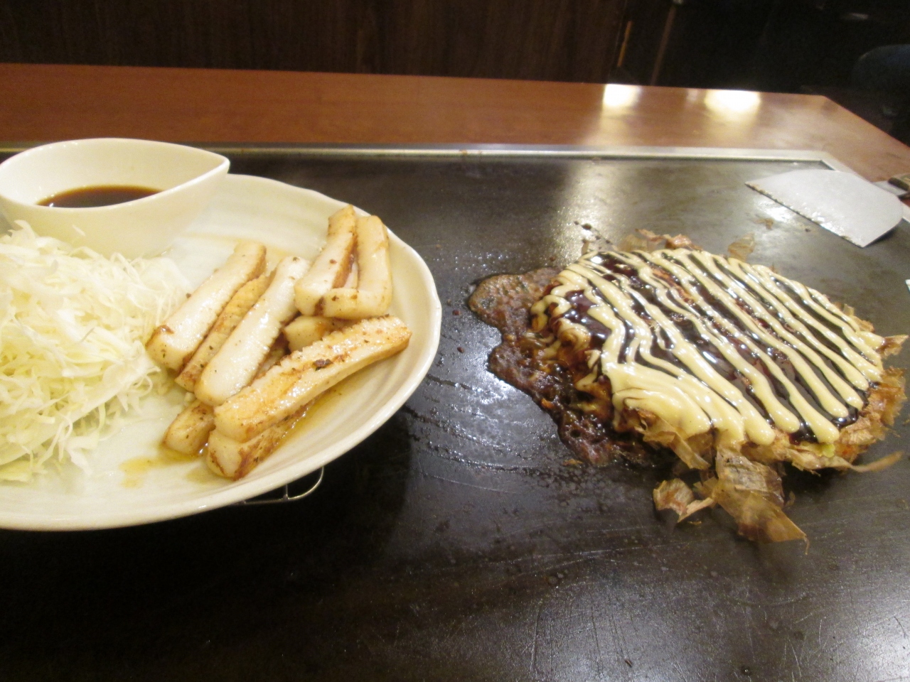 各テーブルで焼き上げるタイプのお好み焼きさんでしたが、となりのテーブルで気になった「イカ焼き」も注文してみましたが、こちらもおいしかったです。
