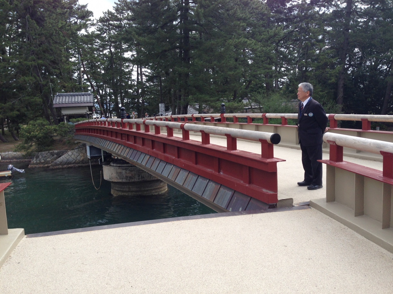 橋が両脇から離れ、横回転してその間を遊覧船が通り抜けました。