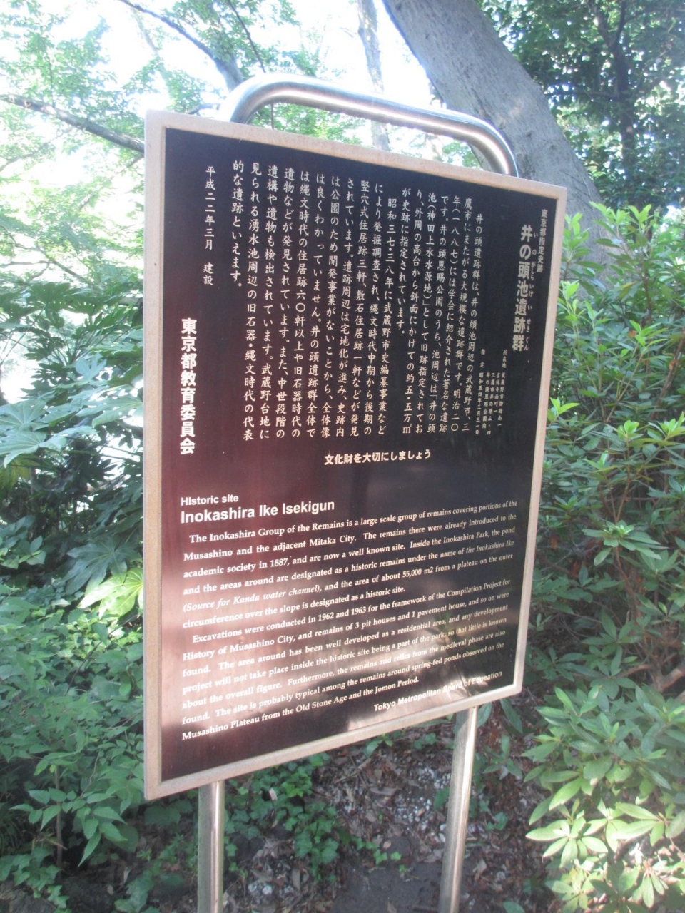 東京都指定遺跡です。井の頭公園内にある井の頭池の南側にある弁財天堂へと渡る橋をの手前に東京都教育委員会が設置した説明板が立っていました。縄文時代の集落跡が主体ですが、出土遺物は東京都武蔵野郷土館と武蔵野市立武蔵野図書館に保管されていて、発掘後埋め戻されてしまっているのが残念だと思いました。