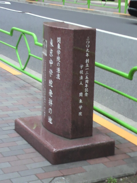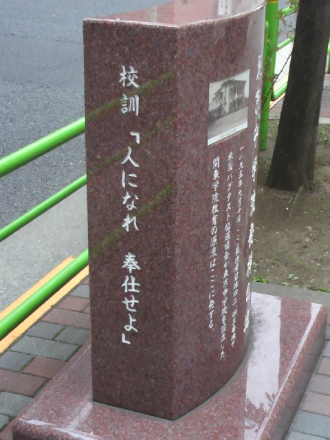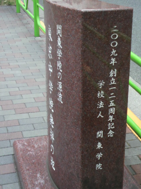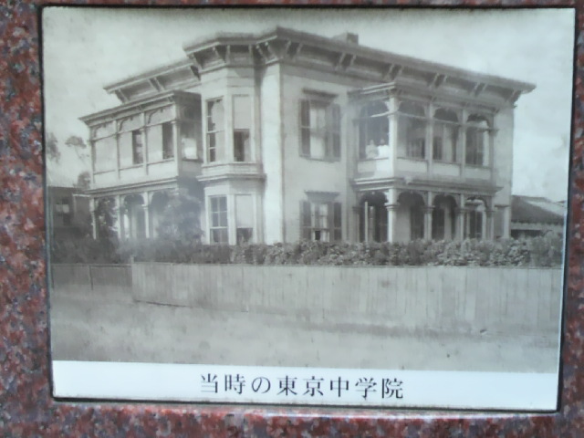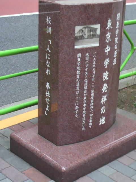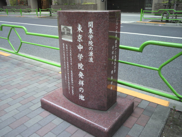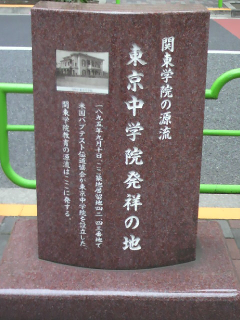 東京中学院発祥の地の碑には、1895年、築地の居住地の42番地、43番地に米国バプテスト伝道協会が、東京中学院を設立し、関東学院教育の源流となっていると記されています。