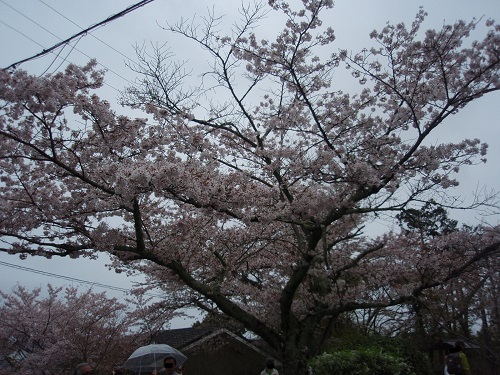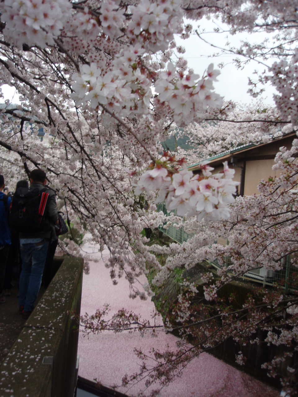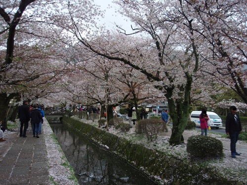 散ったサクラの花ビラが哲学の道沿いの疎水の川面を覆いきれいですよ