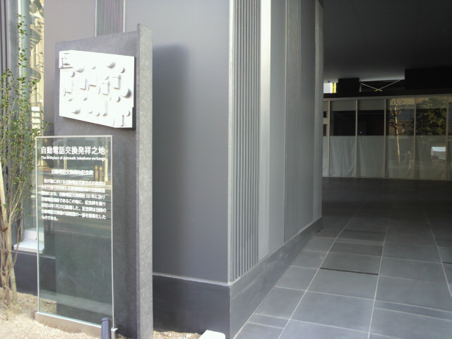 発祥の地としての記念標識板が立てられましたが、京橋電話局が廃止され、跡地は、ホテルに変わり、そのホテルも閉館となり、標識板は、以前あった場所から、新たな建物の横に小移動しています。