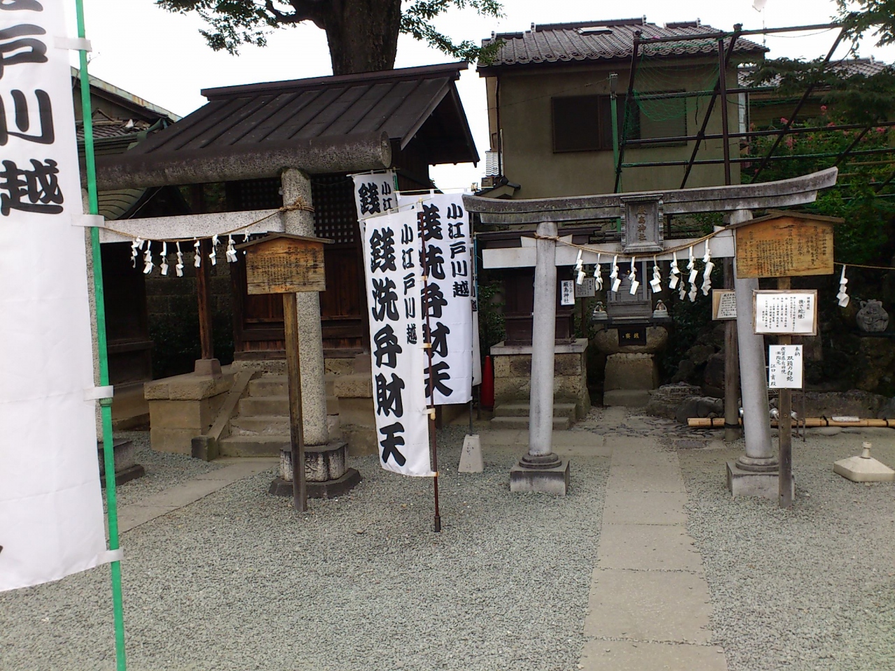 本川越の駅の方から蔵造りの街並みの方へ歩いて行くと、連雀町という交差点の右側に開運・縁結びにご利益がある熊野神社があります。その境内にこの神社があります。小江戸川越、銭洗弁天と書かれた白い幟旗がなびいているので、すぐにわかります。朝早くに行ったので、銭を洗う池の掃除をしている最中で、池の水も抜いてしまっていたので、銭を洗うことができずに残念でした。