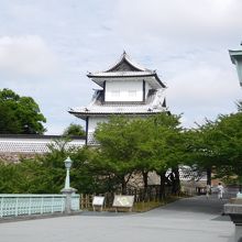 金沢城公園の石川門へと向かう際に渡る橋です。兼六園の桂坂口のすぐ向かい側にあるので、金沢城と兼六園をセットで観光する人達が多く渡る橋になります。朝はまだ観光客の姿があまりいませんでしたが、帰りに通った時は、橋の上で記念撮影をする人達が沢山いました。また、橋の入口付近には、かつてあった「百間堀」の説明書きがありました。