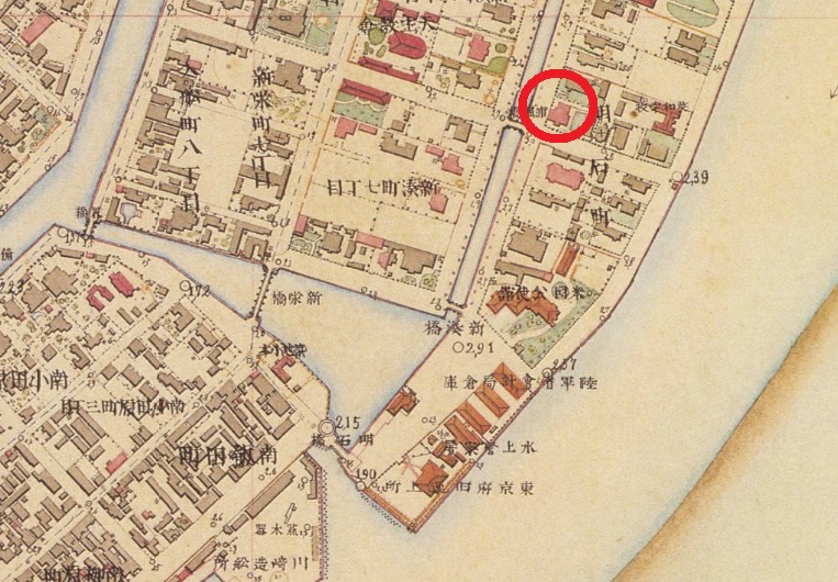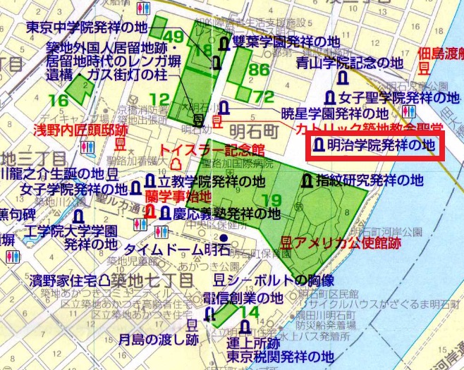 築地の居留地があった明石町7丁目の角の近くに、明治学院発祥の地の碑があります。