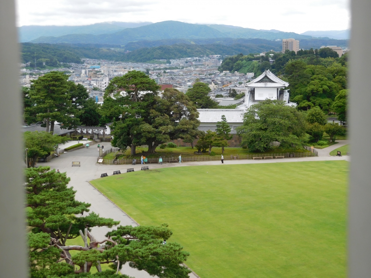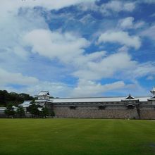 金沢城の石川門から入ると、綺麗に手入れされた芝生の「三の丸広場」が広がっています。奥には、「菱櫓・五十間長屋・橋爪門続櫓・橋爪門」がパノラマの景色のように見えるので、写真を撮るには、ベストな場所になります。訪れた時は夏の暑い時期でしたが、青空と緑の芝生がすごく綺麗で、まさに絵になるような光景が見れました。