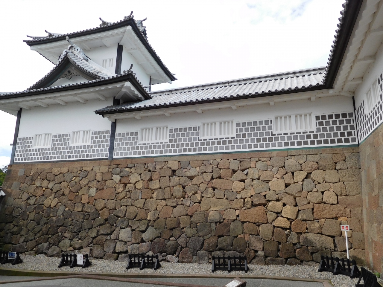 金沢城は、石垣の博物館と言われる程、多くの石垣スポットのある場所です。「自然石積み」、「粗加工石積み」「切石積み」など、様々な技法があり、それぞれの場所には、解説板が設置されていました。石川門の石垣は、右と左で積み方が違うとの解説がありますが、粗加工石積みの方を良く見てみると、石に刻まれた記号のようなものが結構あり、探してみるのがなかなか面白かったです。夏の暑い時期だったので、石垣巡りまでは出来ませんでしたが、興味があれば、巡って見るのも面白いと思います。