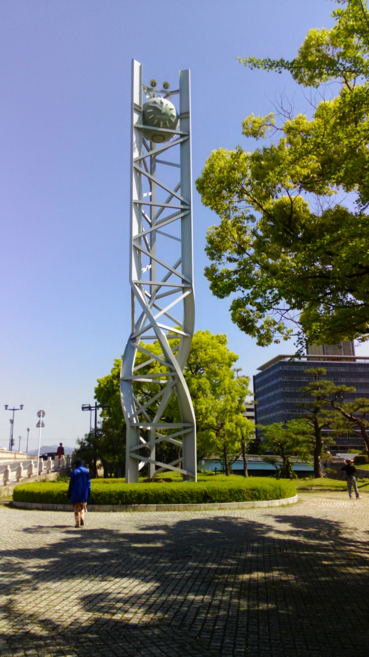 5月4日のフラワーフェスティバルがあった日に平和公園にも立ち寄りました。市内電車の原爆ドーム前電停から平和公園に入るとすぐの場所に高い時計塔があります。毎日原爆が投下された8時15分にチャイムが鳴ります。