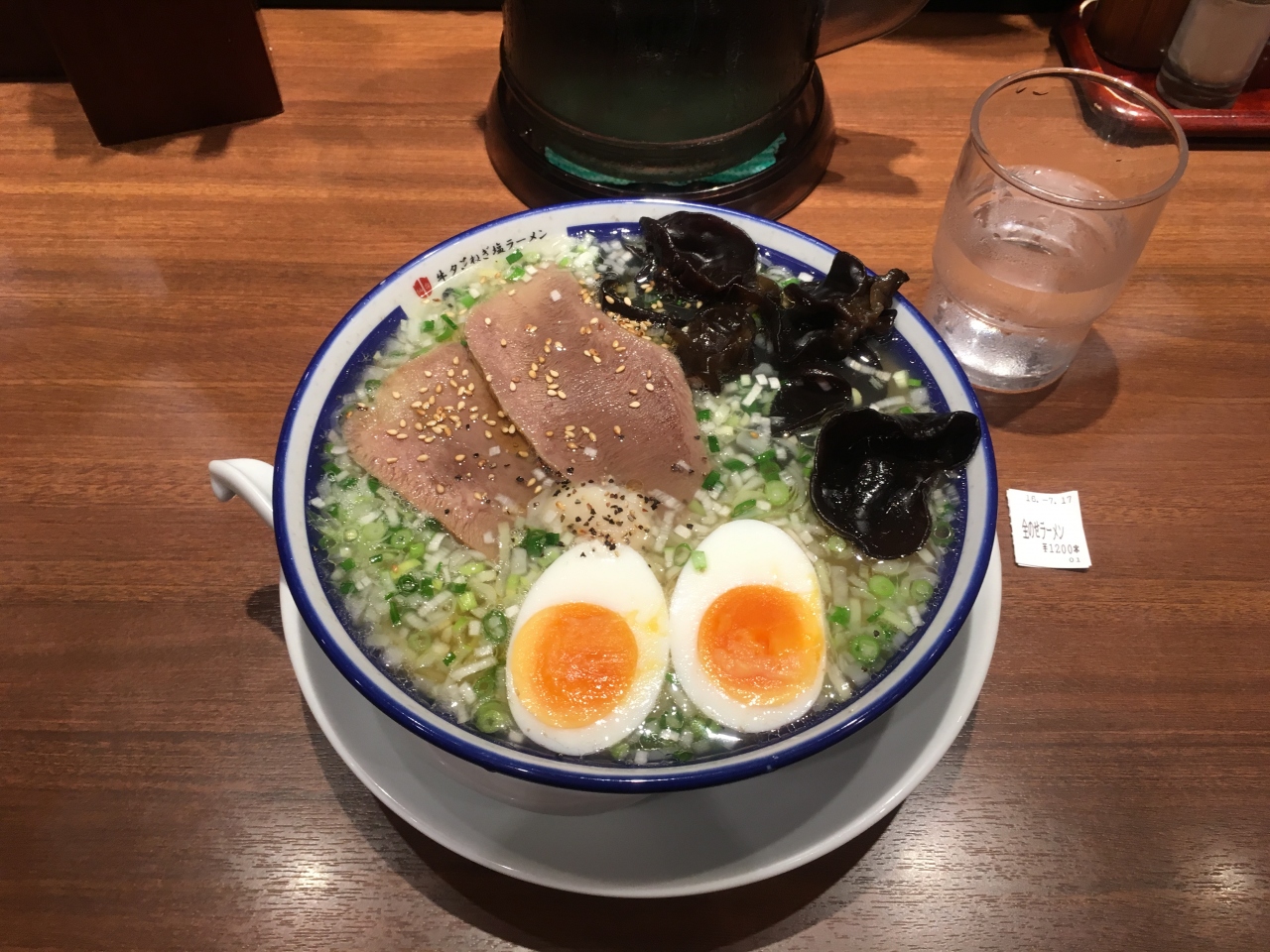 1200円の全部のせラーメンを注文しました。スープ一面を覆うネギの上に、牛タン、半熟塩玉子、きくらげが乗っています。牛タンが柔らかくて、口の中でとろけていき、とても美味しかったです!