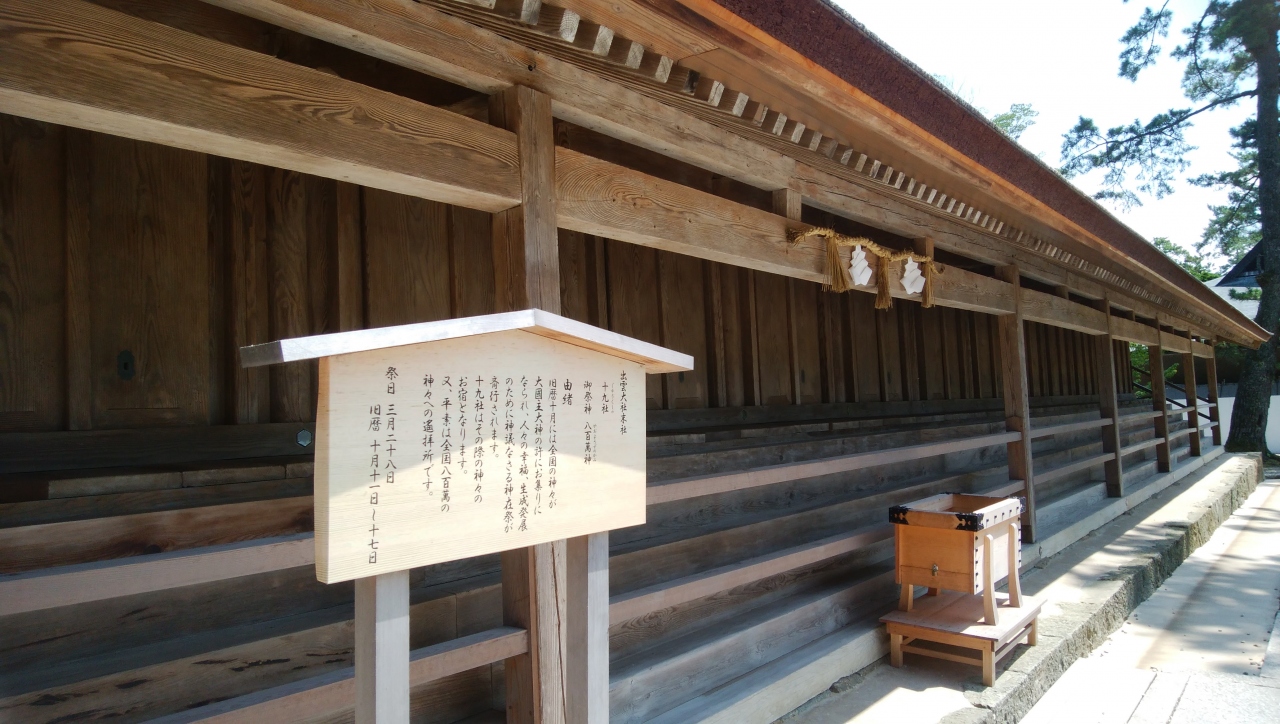 出雲大社の本殿の東側にある社で、末社ですが長い社で長さ30mぐらいはある社殿で、全国たくさんの神社を見てきましたが、初めて見た非常に珍しい社殿です。由緒は旧暦の10月に全国の神々が大国主大神の許に集まり、人々の幸福、生成発展のため神儀をなさる神斉祭が行われますが、その際の神々のお宿がこちらの社ということです。それ以外の時期は全国8百万の神々への遙拝所です。非常に神秘的な場所であり空間です。何とも言えない空気感があります。