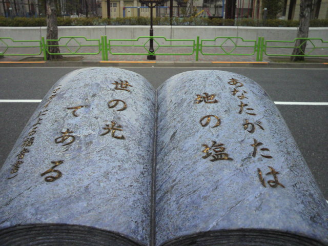 碑の上部には聖書とおぼしき本が開かれ、あなたがたは地の塩、世の光であると書かれているのが見えます。