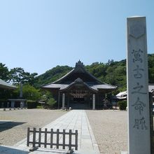 出雲大社の中心エリアである、拝殿、本殿、神楽殿などがある場所からは、西側に少し行った場所にあります。むしろ駐車場に近い場所にあります。少し離れているためか、ほとんど人もおらず、ひっそりとしており、ゆっくり参拝できます。道路に面した場所に大きな石柱が立っており、そこから境内に入ると真正面に社殿があって真っすぐと石畳の参道がつながっております。社殿正面には大きなしめ縄が掲げられており、重厚感を感じさせています。境内自体は参道以外は砂利が敷き詰められており、かなり広い空間になっています。こちらの社は教信徒や氏子のご先祖の御霊をお祀りしている場所です。
