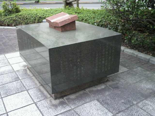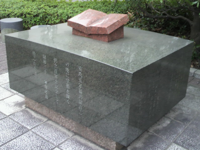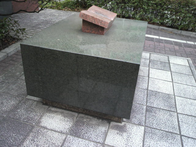 慶應義塾開塾の地の碑が、明石町の居留地中央通りと聖ルカ通りの道路三角角地に置かれています。