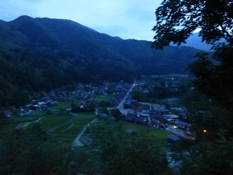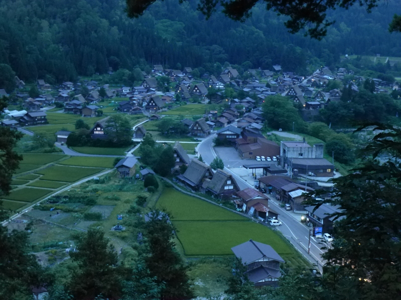 懐中電灯持参し、夜景をみに展望所(荻町城址)に登る。幾つかの合掌造りにライトがともり、上から見ると何とも言えない風情で、きれいである。 田圃まで下りほたる鑑賞する。源氏ボタル、平家ボタルが見られた。久しぶりのホタル鑑賞である。昼の騒然とした中での散策異なり、静かに心癒される風景である。是非お勧めします。
