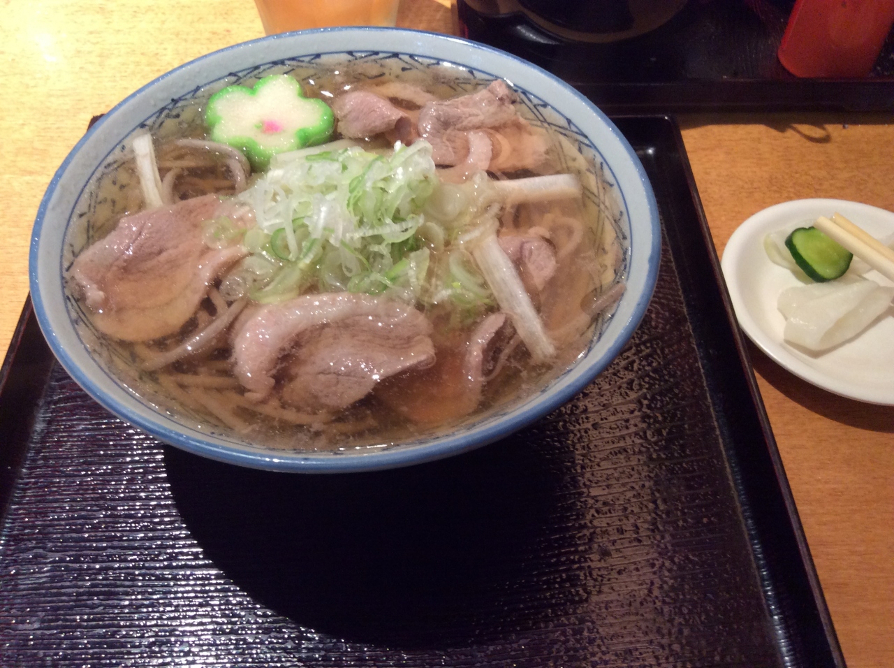 お昼を過ぎた時間に入店。近くのむじゃきには行列ができていたが、こちらはそうでもなかった。そばは太いのと細い普通のものが選べるらしい。普通そばで鴨そばを注文。結構早くできてびっくり。食べ放題の大根のつけものと食べました。私には麺がやわらかすぎた。