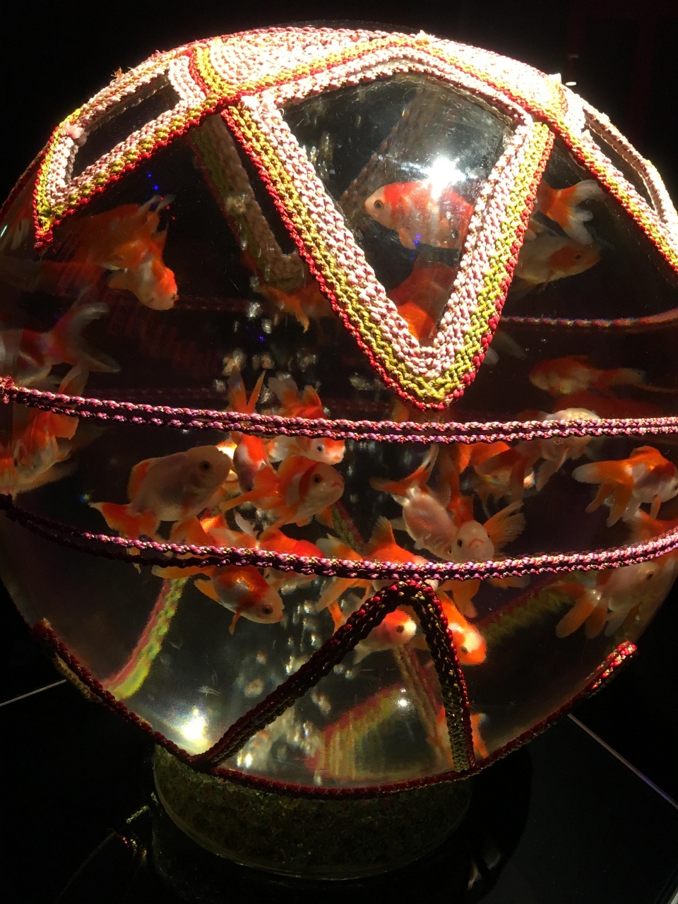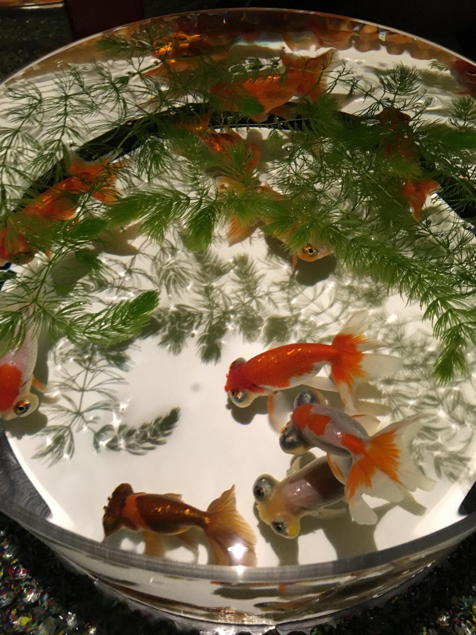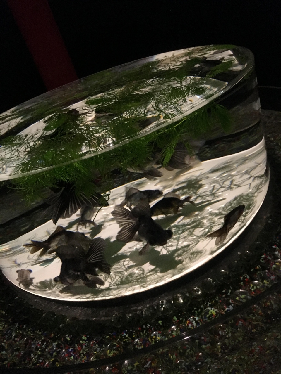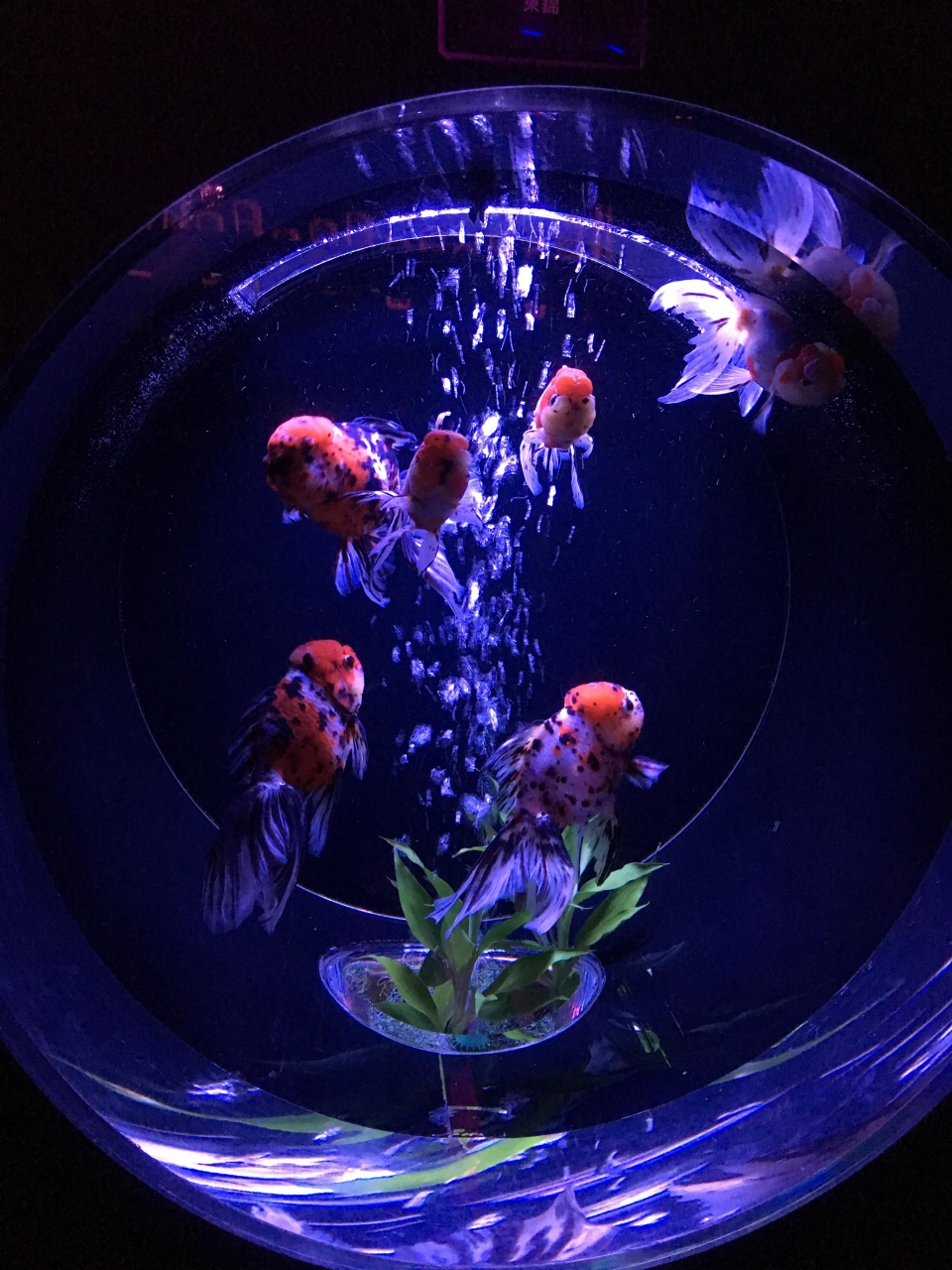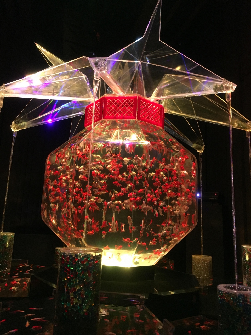 とても人気なので人がとても多かったのですが、AM10:00くらいに並んでAM111:30くらいには入れました。空調が効いているので人が多くても暑いということはありませんでした。水槽の形も様々で水も綺麗で金魚の見え方がそれぞれ違っていて綺麗でした。金魚の種類が多いので見ていて飽きることはないです。超・花魅はとても大きく照明が赤・ピンク・青・緑・黄色にかわって綺麗なので子供たちも喜んでおりました。最後のほうに、ビョウブという作品がありましたが、とても人気で混雑しておりましたが、見る価値は十分にありました。会場を出ると小さな休憩スペースがあり、アートアクアリウムらしい金魚をモチーフにした飲み物や食べ物があり、見た目はものすごく綺麗なのですが、味はそんなに美味しくはなかったのが残念でした。
