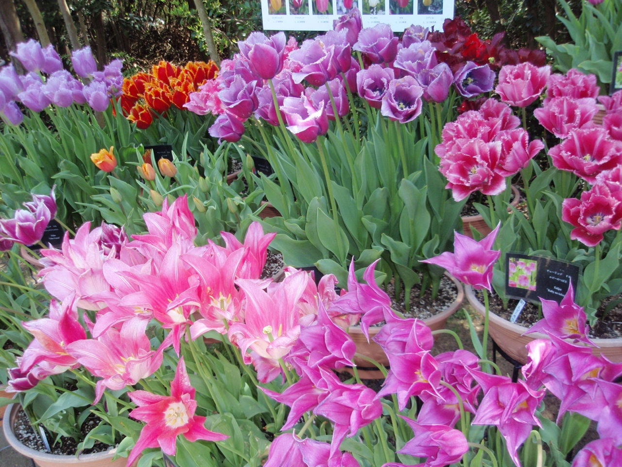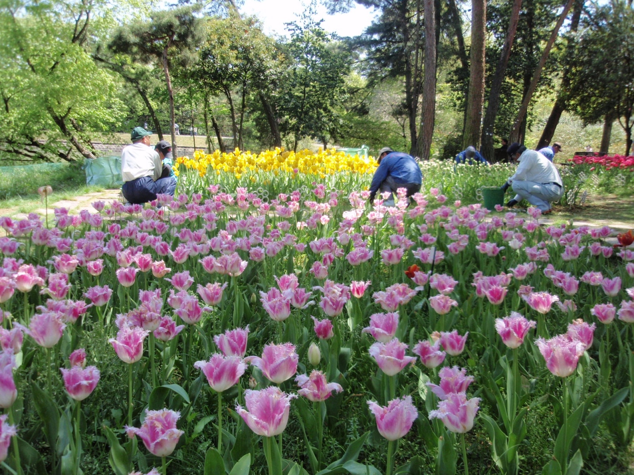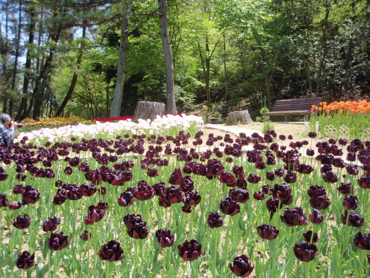 46haの敷地にチューリプ花壇、アジサイ、ボタン、ツツジ、シャクナゲ、ウメ、サクラ等の園地を配し、四季折々の花を楽しめる。今30万本のチューリップが満開ということで訪れる。赤、白、ピンク、黒(濃い紺)、黄、橙の単色、これらの2色花、一重、二重、花弁先のギザギザあり等450種、30万本の花が満開である。目を奪われるほど見事である。(中には終了しているものもある)。