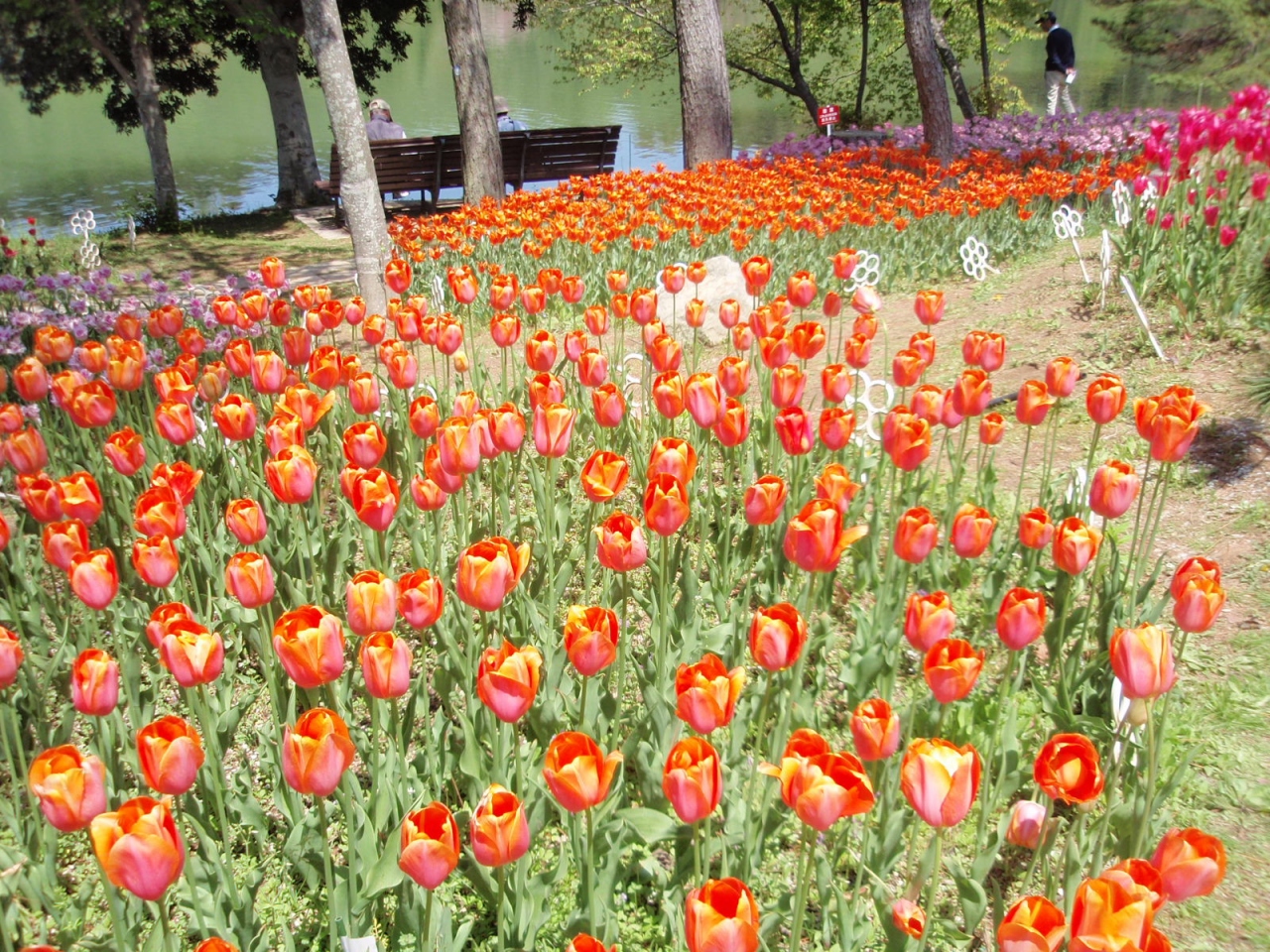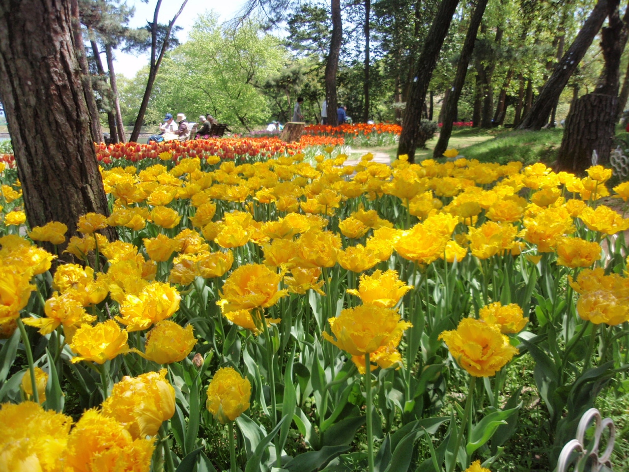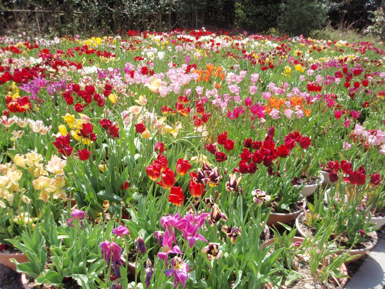 46haの敷地にチューリプ花壇、アジサイ、ボタン、ツツジ、シャクナゲ、ウメ、サクラ等の園地を配し、四季折々の花を楽しめる。今30万本のチューリップが満開ということで訪れる。赤、白、ピンク、黒(濃い紺)、黄、橙の単色、これらの2色花、一重、二重、花弁先のギザギザあり等450種、30万本の花が満開である。目を奪われるほど見事である。(中には終了しているものもある)。